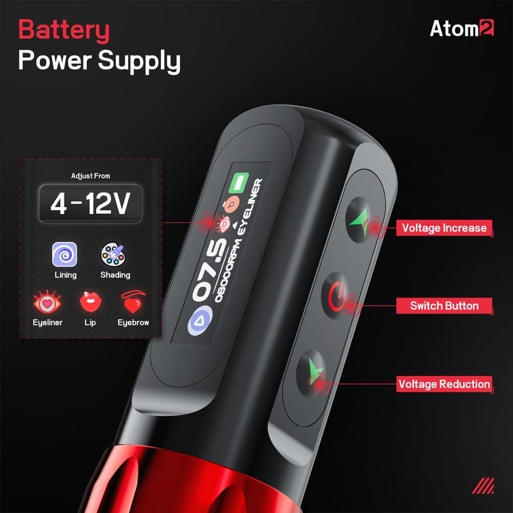 • 【Upgraded Atom2 Machine】: The new Atom2 features a smart screen and five built-in operation modes (Lining, Shading, Eyeliner, Lip, Eyebrow); quieter with vibration-free vs previous Atom tattoo pen; smart memory saves your used settings