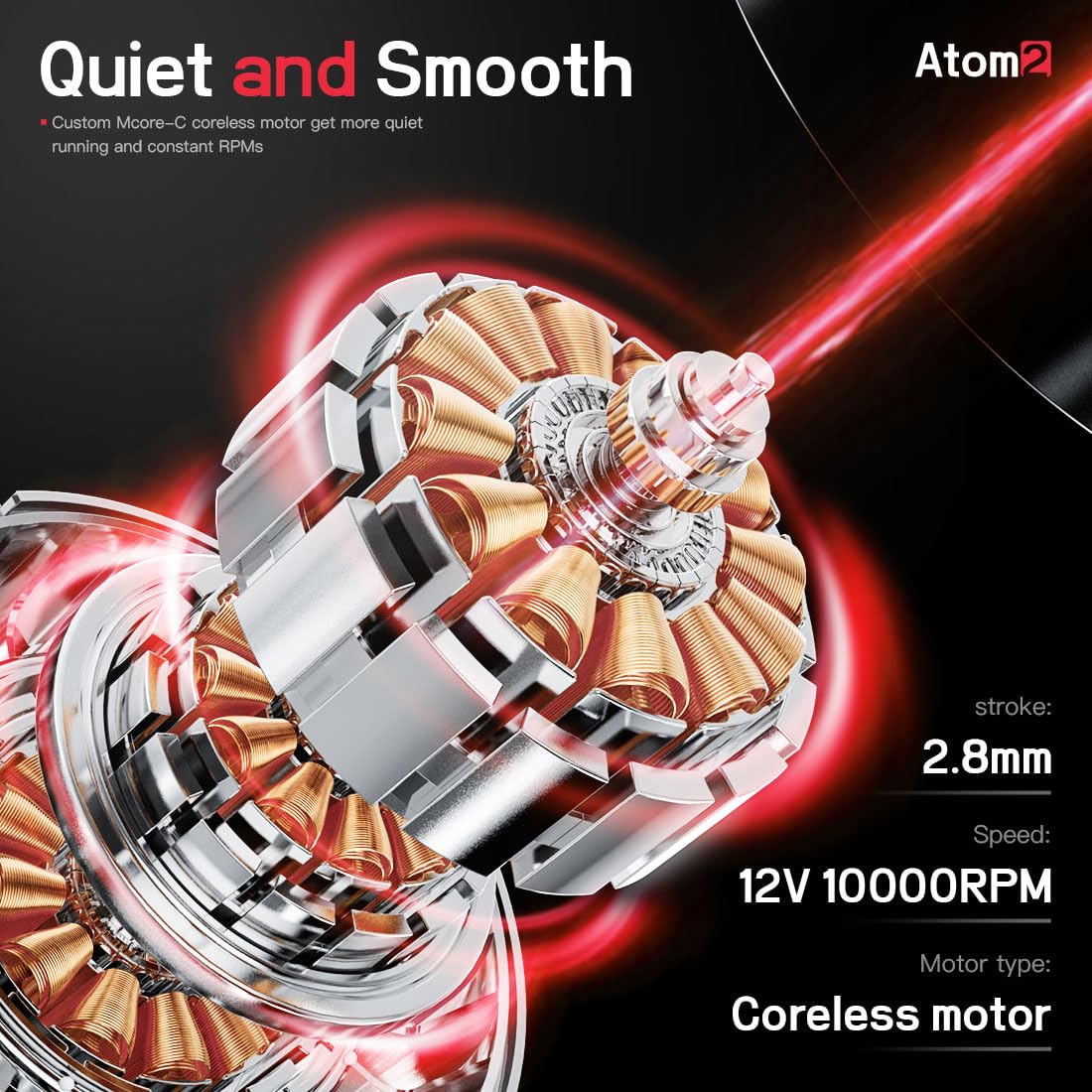 • 【Slim & Lightweight Design】: Weighing just 111g(3.9oz), the slim, ergonomic Atom2 tattoo gun is easy to handle, ideal for female artists, cosmetic tattooing, and long sessions without fatigue; great for beginners and professionals focused on precision work