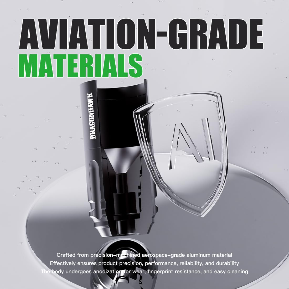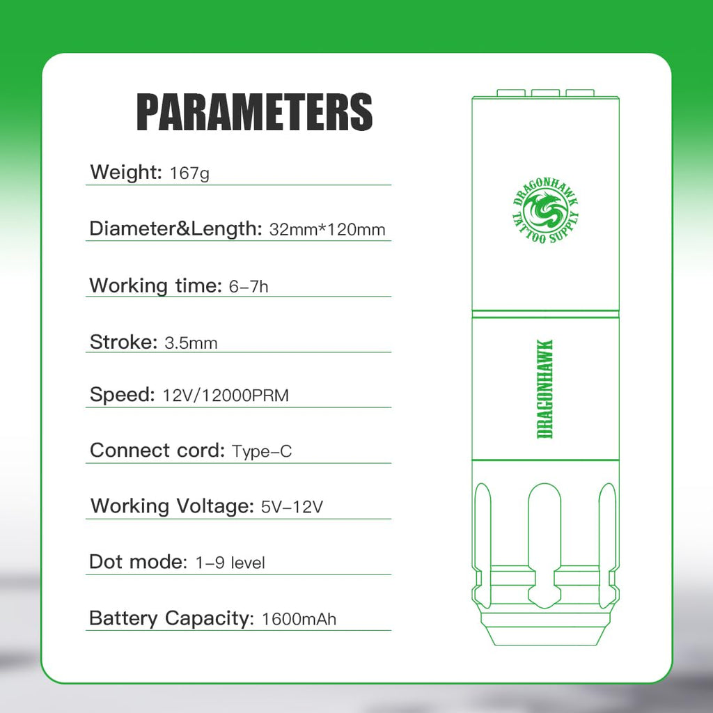 • Wireless Tattoo Machine: The Dragonhawk tattoo machine boasts advanced wireless technology for unrestricted movement. Made from lightweight, durable aluminum alloy, it measures 120mm in length and 32mm in diameter, weighing just 167g for a comfortable grip and precise control. Its segmented design allows for easy part replacement and maintenance.