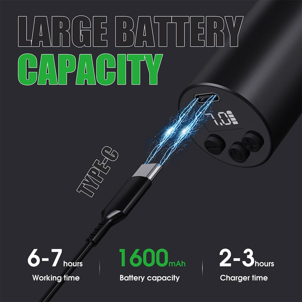 • High Capacity Battery: With a 1600mAh battery, the wireless machine offers 6-7 hours of use on a single charge. The adjustable voltage (4V-12V) and LED display ensure consistent performance and real-time power status. The machine features a high-grade positioning steel ball for accurate needle adjustments and clear feedback.