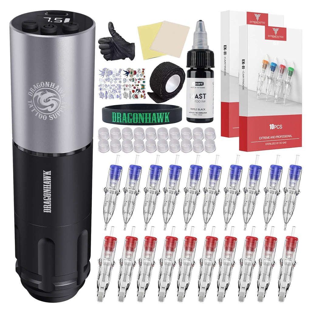 Dragonhawk A1 Beginner Tattoo Kit, Wireless Complete Pro Tattoo Gun Pen Machine Kit, Cartridges Tattoo Machine Needles