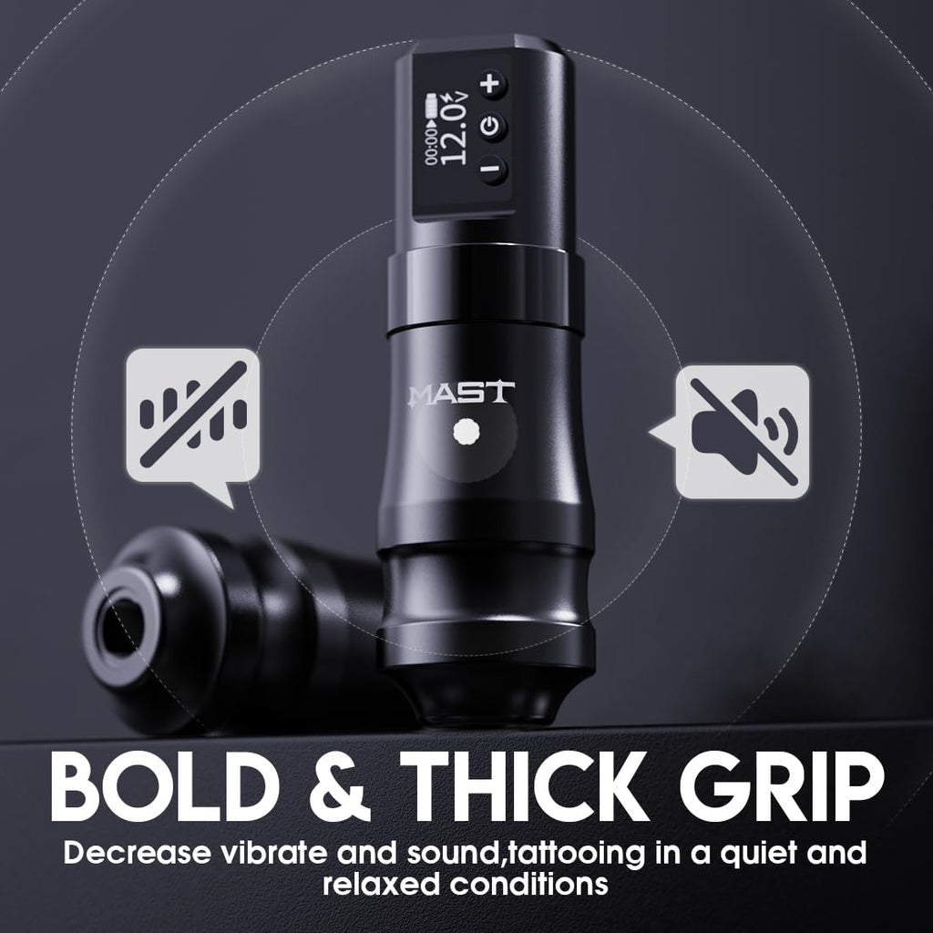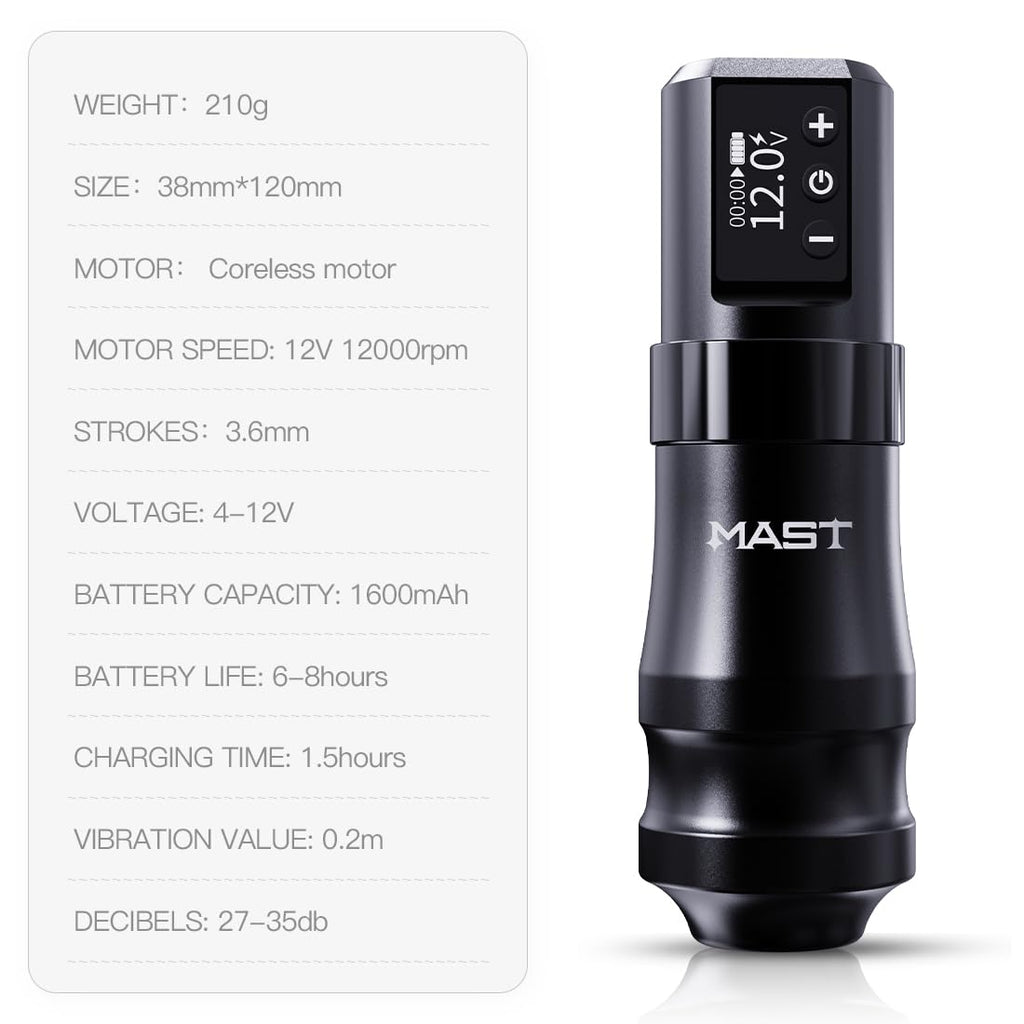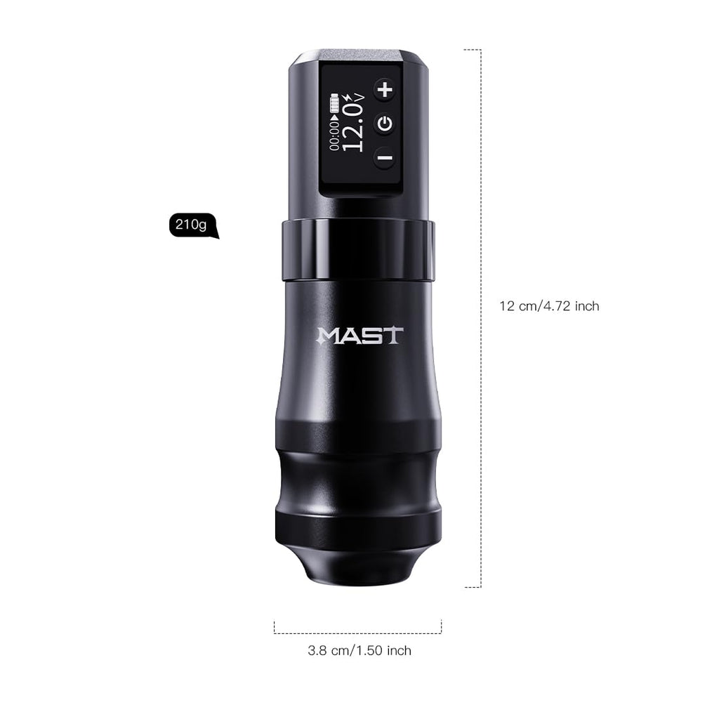 - Information: The Mast Mini wireless pro tattoo gun has a grip of 38mm and a length of 120mm, which is shorter than other mast machines. It has an mcore-c1 coreless motor, weighs 210g, and has a 1600mah battery power supply with fast charge.